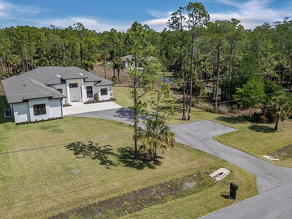 Have you been searching for a brand-new Naples estate home with ultimate privacy and room to roam? Built in 2024 and set on 2.73 acres in peaceful Golden Gate Estates, this beautifully designed residence offers a rare blend of modern finishes, wide-open space, and freedom—without the restrictions of an HOA. Surrounded by natural landscape and backing up to a quiet, private backyard, this three-bedroom plus den, three-bath home delivers serene indoor-outdoor living in a tranquil setting. A paved driveway leads to the two-car garage and French door entryway, opening to a light-filled foyer with a tray ceiling and impact glass windows throughout. The open-concept floor plan showcases 32-inch tile flooring in main areas, with warm laminated vinyl floors in the guest bedrooms, and elegant touches like champagne bronze cabinet hardware. The spacious living area features a tray ceiling and glass sliders that lead to the lanai and expansive backyard, perfect for future outdoor amenities or simply enjoying the peaceful surroundings. The kitchen is a showpiece with its double waterfall-edge island, granite countertops and backsplash extending to the cabinetry, modern white cabinets with gold hardware, and a walk-in pantry. Smart Samsung appliances include a built-in microwave, wall oven, electric cooktop, and sleek refrigerator/ freezer. A brushed brass pull-down faucet and pendant lighting complete the space with a polished, designer touch. The primary suite is a peaceful retreat with direct lanai access, two spacious walk-in closets, and a spa-style en-suite bath featuring a freestanding soaking tub, dual vanities, and a walk-in shower with a rain showerhead, built-in bench, and frameless glass enclosure. Two additional bedrooms offer ceiling fans, ample closet space, and access to two full guest baths—one with a shower tub combo and full tile surround. A glass-doored den/gym and a private office with French doors add versatility, perfect for remote work, fitness, or creative space. A full water filtration system enhances everyday comfort, while the laundry room is equipped with a utility sink, ample cabinet storage, and a stackable LG washer and dryer for added functionality. The garage features windows, bringing in natural light to the space. With no HOA and endless possibilities for customizing your outdoor living—whether adding a pool, garden, or guest house—this Golden Gate Estates property offers the best of secluded estate living, just a short drive from Naples' beaches, dining, and shopping. Your private retreat is ready—schedule your tour today.