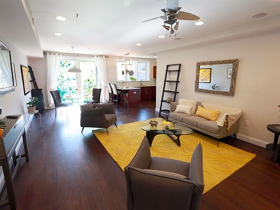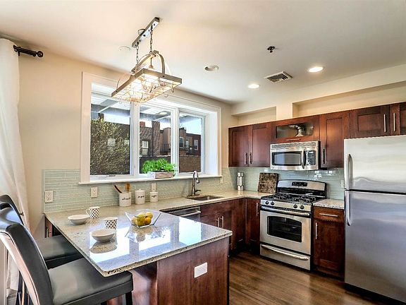 Optimal floorplan for a 1,280 square feet 2 bed 2 bath in a newer boutique condo building. Full-size keyed elevator from the ground floor takes your family and friends up opening directly into a spacious living room, dining room and open kitchen. Newly refinished Brazilian cherry wood floors, freshly painted walls and recessed lighting. Modern kitchen with granite breakfast bar, SS appliances including newer Bosch dishwasher, custom cabinets and large windows. The dining and living room spaces receive abundant natural light from large Pella floor-to-ceiling sliding glass doors that open up to a beautiful large terrace. Large dense trees outside of the balcony provide green scenery and privacy. Bedrooms with bay windows and crown molding. Bathroom floors and walls are wrapped in striking marble tiles. Dedicated laundry room near bedrooms with recent LG W/D. In-ceiling surround speakers and wiring through wall to conceal entertainment equipment in nearby closet plus wired to outdoor balcony speakers. High efficiency HVAC located in spacious closet in hall outside of the residence with room for extra storage. Phenomenal location: right across from Fiore's famous mozzarella shop; a restaurant, pharmacy and dry cleaners all on the same block; 5 min walk to 126 Clinton-Willow bus line to/from NYC, grocery store, Church square park, several schools and daycares, library, and many restaurants; 15 min walk to PATH; multiple parking options available nearby.