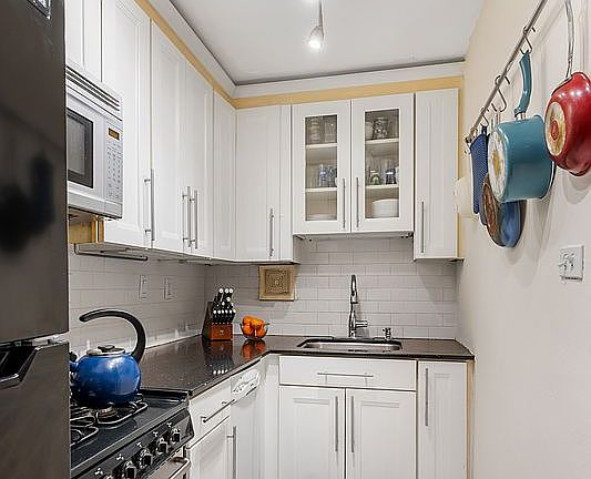 In the kitchen, discover a suite of scaled appliances including an 18-inch dishwasher, set against striking black quartz countertops, white subway tile backsplash, and chic white shaker cabinets.