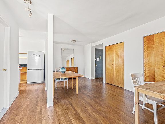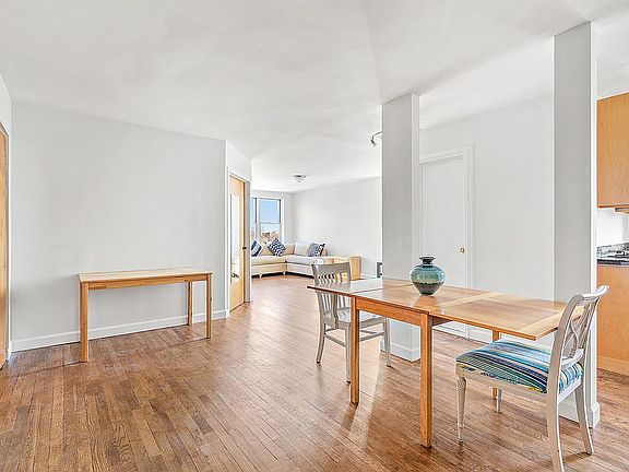 On a high floor, with unobstructed views and facing quiet side streets, Apt 6E has been thoughtfully renovated to maximize living space and create a nourishing atmosphere. The apartment is currently configured with a large foyer/dining room/office area (with two huge closets!!) that leads to an equally large living area. It could be very easily flexed to create a second bedroom without compromising sunlight due to the many windows facing south and east. The galley kitchen has custom marble countertops and stainless-steel appliances. The bedroom will easily fit a king size bed along with furniture and has a large closet and a wall of windows.