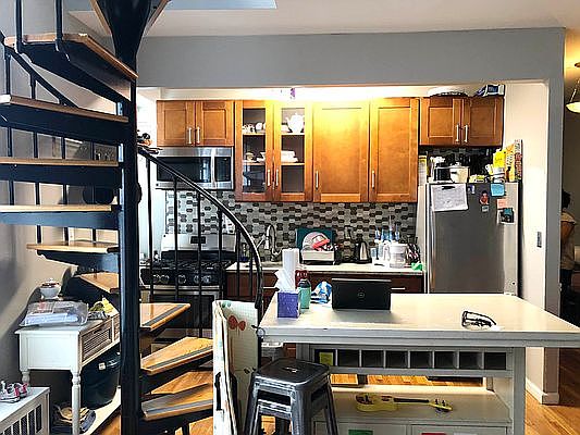 Unique Duplex Available in lovely Kensington elevator coop building. Private outdoor roof rights !! This apartment is the only unit in the building with roof access. Open Living-Dining area with exposed brick wall and hardwood floors One Spacious Bedroom with wall of California closet Upper level has a smaller second bedroom and large shower bath. The private outdoor space belongs to you and the stars! Enjoy rooftop dinners - the picnic tables already there! The building has laundry, live-in super and pets are OK Short distance to F and G trains to Manhattan and convenient Church Avenue shopping.
