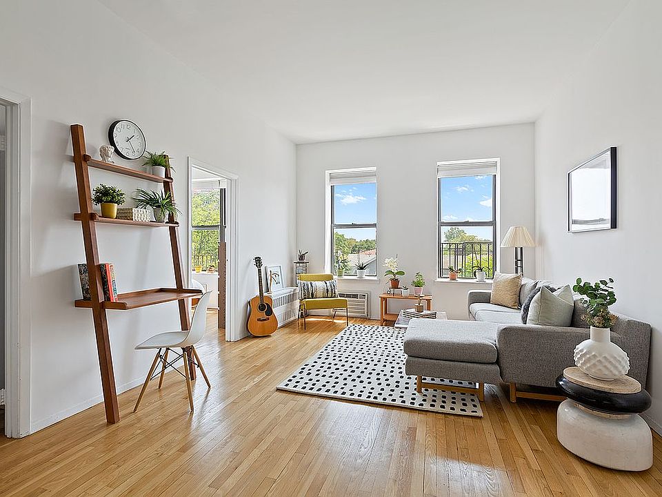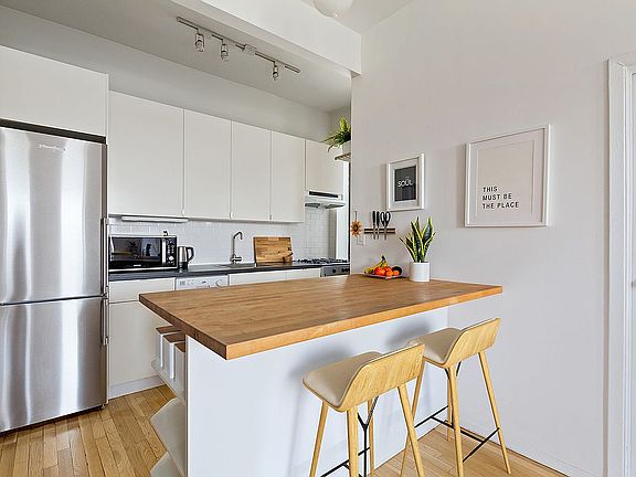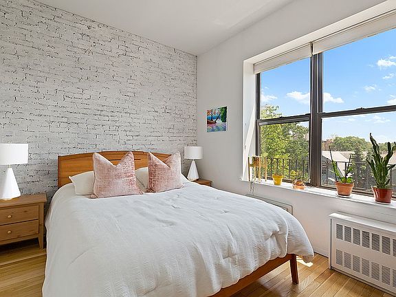 This urban oasis is exactly what you have been searching for. Sun-drenched with ceilings just under 10-feet, exposed brick and beautiful hardwood floors throughout. This beautifully renovated TOP floor 2 bed, 1 bath is a rare gem and set in a meticulously maintained, pre-war elevator building. Enter into the foyer with ample storage which opens to an expansive living room with space for dining, two large south-facing windows and a stylishly remodeled open kitchen featuring a butcher block breakfast counter with seating. The windowed kitchen features a dishwasher, tasteful white cabinets, and a sleek subway tiled backsplash. There are two generously-proportioned bedrooms, each with ample closet space along with and tiled windowed bath with a linen closet. Beautifully refinished hardwood floors flow through the entire apartment. Ideally located on the border of Kensington and Windsor Terrace, just blocks from Prospect Park, the F/G at Church Avenue, and plenty of shopping, dining, and services and within walking distance to the restaurants and shops along Cortelyou Road. The building is pet-friendly and features a common laundry room, an onsite super and porter, and bike storage. Maintenance includes heat, hot water and cooking gas.