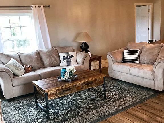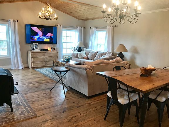 3 Bed 2 bath craftsman style home with Tennessee river and Mountain views. Enter into an open concept floor plan with living room, dining area and kitchen. The Living room features beautiful tongue and groove vaulted ceilings and a new wood burning stove. The kitchen includes an island, all stainless steel appliances, a stainless steel single basin farmhouse sink, and a walk in pantry. the laundry area opens up to a large covered porch with mountain views. this floor plan also features split bedrooms. The right side of the house has two bedrooms, a full bathroom, and a den/office area. the left is a master suit. The master bath includes a double sink vanity, garden soaking tub with shower and a walk in closet. The home has beautiful views all around. The front has river views as well as wonderful sun sets over the water and the back has mountain views. the property has 10 acres that are mostly cleared and 6 +/- acre is fenced for animals. There is also a small barn with small pen, the barn is new and just built in 2018. This homestead is all within walking distance to a marina with boat ramp access and docks for fishing.
