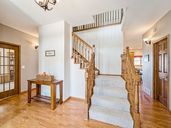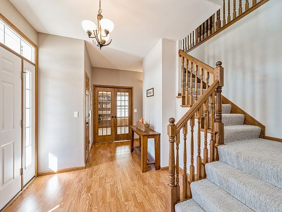 Immaculate, spacious 2 story ready for new owner. Located in a cul-de-sac offering a low traffic area. You will be astonished from the moment you enter the open foyer greeted by new carpet and fresh paint throughout. Main floor boast of the open kitchen with quality cabinetry, island, walk in pantry, built in glass hutch, desk and dining. Gas fireplace with shelving and cabinets in the living room. French door to office/den area. 1st floor laundry, half bath and drop zone with large closet connecting to garage. Lower level with walkout offers wet bar in rec room, non-conforming br, full bath and 2 additional storage areas. 2nd floor has 4 bedrooms including a master br/bath with walk in closet, double vanity, jet tub and shower. Lovely bonus room with arch windows for craft, play or study. Geothermal heat and air. New roof, patio, deck, basketball hoop. Oversized 3 car. Plenty of room for play and relaxing on over 1/4 acre.