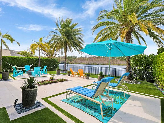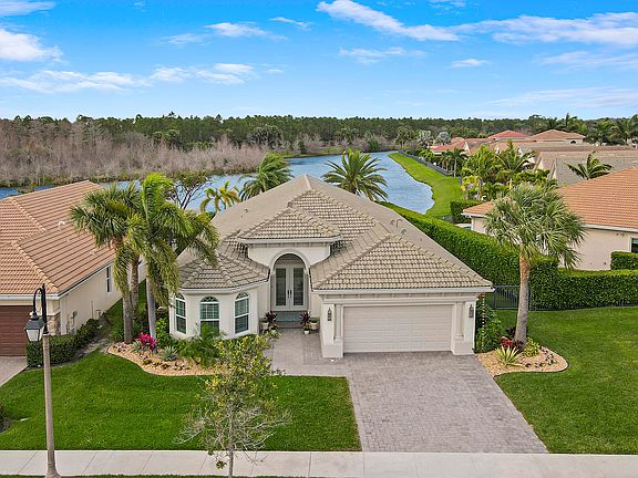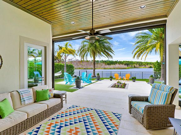 If an amazing view and privacy is important to you, be sure to tour 415 Castalina Court, a lakeside piece of paradise in Jupiter Country Club. This stunning Saranac model by Toll Brothers offers a tranquil retreat with breathtaking views of the lake and Riverbend Park. Built in 2014, this home boasts 3 bedrooms, 2 1/2 bathrooms, and a den/office (or optional bedroom), providing ample space for comfortable living. From the moment you open the front door, you are captivated by the views that are second to none! Enjoy a spacious home with tons of natural sunlight, creating a perfect setting for relaxation and entertainment. The well-appointed kitchen features a huge granite island, gas range, tons of storage, full pantry, dining room and more, making it ideal for both everyday living and hosting guestsYou will spend your days outside enjoying the relaxing well-thought out space! The patio and back yard are an absolute paradise, featuring travertine decking with turf, tropical landscaping, a fire pit, and multiple seating areas. The patio also boasts tongue and groove ceilings, a hurricane rated motorized screen, giving you the ability to open the space completely when desired. The private back yard and large side yard are fully fenced to offer a sense of seclusion and security. Additional features include impact glass, a new AC (2024), freshly painted exterior, and an air-conditioned garage with split AC and extra storage. The home also boasts a new hot water heater, making it move-in ready for its new owners. The location is perfection with water and preserve views, a quiet street with very little traffic and zero road noise from the highway. With its serene setting and modern comforts, this home is perfect for those seeking a lock-and-leave lifestyle or a peaceful full-time residence. Don't miss the opportunity to make this home your own. Jupiter Country Club is a luxurious private country club offering world-class amenities and an exclusive community of single-family homes and carriage homes. The Grand Clubhouse is a magnificent hub of activity, featuring impressive on-site dining and entertainment, bocce ball courts, fully stocked men's and women's locker rooms, as well as a golf shop for enthusiasts. For fitness enthusiasts, the Sports Club is a state-of-the-art facility equipped with everything needed to achieve your fitness goals. From free weights to cardio equipment, tennis, Pickleball, and multi-purpose sports courts, this facility offers a comprehensive range of options to cater to all fitness preferences. There are 2 pools and a Childrens playground. The community has a 24 hour manned gate and roving security. It is conveniently located just minutes to I95 and the Turnpike, as well as, a plethora of shops, dining and entertainment.