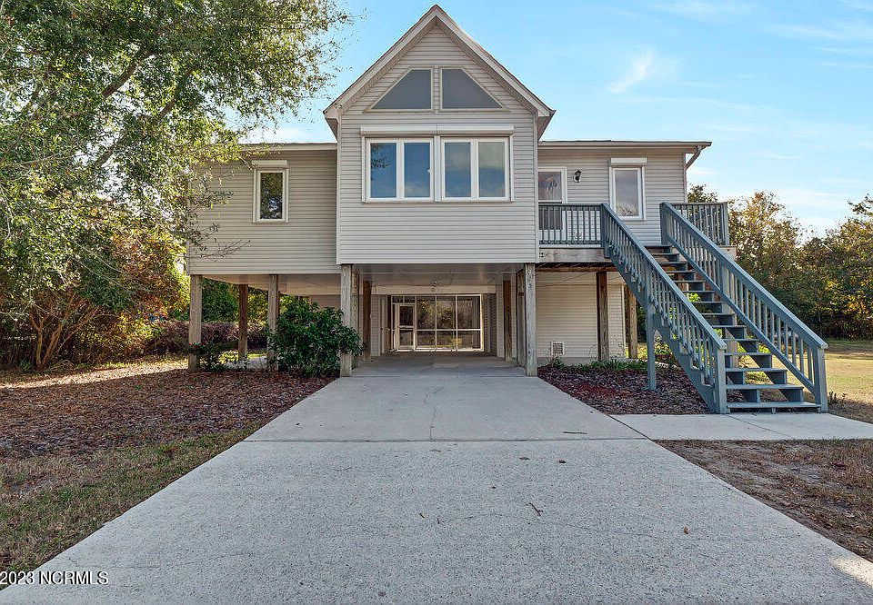 This wonderful 3-bedroom, 2-bath home is situated on a large double lot (0.29 acres) in a quiet residential community (no HOA!) close to the beach, downtown Carolina Beach and the CB Boardwalk, the Carolina Beach Lake, and the Island Greenway Bike Path. Its combination of outdoor and indoor amenities makes it the perfect beach home. As you walk in, you will notice the large open floor plan with a fabulous cathedral ceiling featuring beautiful, exposed wood beams. The wall of windows offers plenty of natural light. A split-bedroom floor plan is perfect for family and guests, offering a private master bedroom with en-suite bath and a large walk-in closet, and two guest bedrooms that share a full bath. Abundant outdoor areas include a front porch, covered back deck, and large screened porch on the ground level that overlooks the backyard (all freshly painted). A desirable 100 x 125 lot offers plenty of room to add a pool, firepit area, and/or patio. This home boasts plenty of upgrades including a fortified architectural shingle roof (2018), roll-type hurricane shutters (2019), quartz countertops in the kitchen, new stove and built-in microwave (2022), new LVP floors in the main living areas (2023), bamboo floors in the bedrooms, and fresh paint in the main living areas and master bedroom. There is a laundry room on the ground level, as well as ample carport and driveway parking areas and a large storage room for all your beach toys. Due to its location, amenities, and upgrades, this home would make a fabulous primary or 2nd-home or a terrific investment/rental.