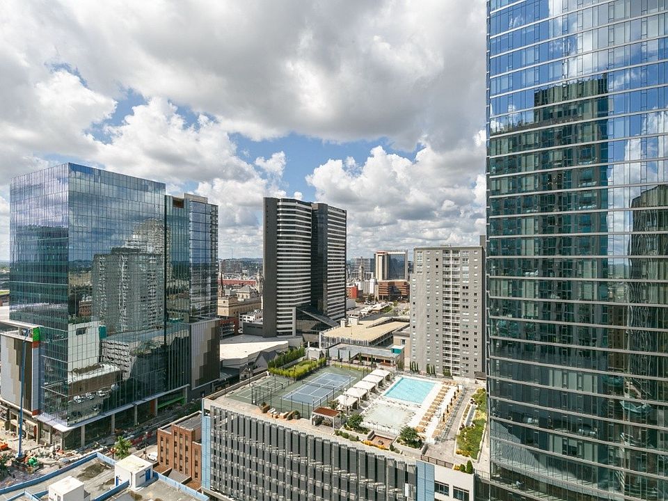 The best 1 bedroom floor plan in the Viridian and on the 18th floor to boot! Floor to ceiling windows, Unrivaled Rooftop amenities- pool, fitness center, and club room all bring stunning views daily and nightly. Simply take a ride down the elevator to make a grocery run at the HG Hill Market located on the 1st floor! Only steps to the Arts District, Printer's Alley, Bridgestone Arena, etc.. 1 garage parking space & guest parking available in. See link in MLS for full video of unit!