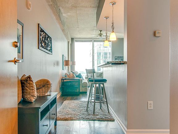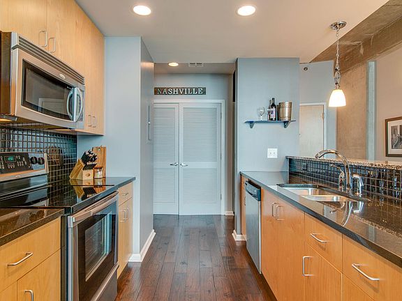 Enjoy watching colorful sunsets and the growing Nashville skyline from the expansive west facing views in this chic city flat. This is the 2nd largest 1BR floor plan in the bldg & Rare to come to market! Great flow, newly added gleaming hand scraped engineered hardwood floors, updated lighting.