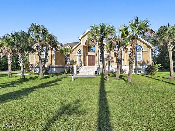 Southern Estate w/ space & grace awaits! Perfectly situated btwn. Bluffton/Hilton Head & Savannah, this 4BR/4B 3,600 SF home on 3 Acres offers easy access to shopping/dining/entertainment w/ plenty of room to relax & play. Swaying palms frame the welcoming travertine stairway & 20 ft. portico leading to a light-filled foyer & family room. Modern classic touches such as beadboard ceiling & Deco style fireplace w/ wood mantle add complementary character for any decor. Spacious rooms w/ high/smooth ceilings & lots of windows. Lagoon & wooded lot w/ huge open yard for recreational vehicles. No HOA!
