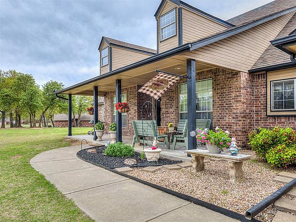 An eye-catching one story ranch style home that sits on a 1.24 acre lot! This corner lot has several trees, a 10 x 16 outbuilding (2021) & carport (2022). The exterior is finished in a gorgeous multicolored brick & has two accent dormers & shutters. The large covered front porch is the perfect place to relax day or night. Enter to find beautiful wood flooring, elegant lighting & a perfected color scheme that makes this home feel light & airy. There is no carpet in this house! Your focal point is the living room's fireplace along with the windows that allow lots of natural lighting. It has a recessed ceiling with a fan, extra can lights & plenty of built-ins. A well thought out floor plan with the kitchen, dining, laundry & primary suite plus bath on one side & three guest rooms & bathroom on the other side. The dining room is conveniently opened to the kitchen. The U-shaped kitchen has a newer butcher block island, stainless steel appliances (2019), quartz counter tops & offers plenty of counter top & cabinet space. The sink has a window offering a view of the front yard. The laundry room is off the hall between the kitchen & primary suite. It has built-in cabinets & a folding area plus access to the garage. The primary suite is large in size with a recessed ceiling, elegant lighting & a gorgeous remodeled primary bathroom. This bathroom has a new vanity top & sinks, tile flooring, soaker tub and accent paneling. There is also a walk-in shower. The large walk-in closet has built in drawers & shelves. The guest rooms all have ceiling fans & wood flooring. The guest bathroom has a new vanity top, sinks & tile flooring. This home has went through many more updates since ownership. No HOA fees! Easy access to HWY 62, minutes from schools & right on the edge of town. A short drive to Norman. Country living at its best in a true community neighborhood! This home qualifies for a USDA Home Loan!