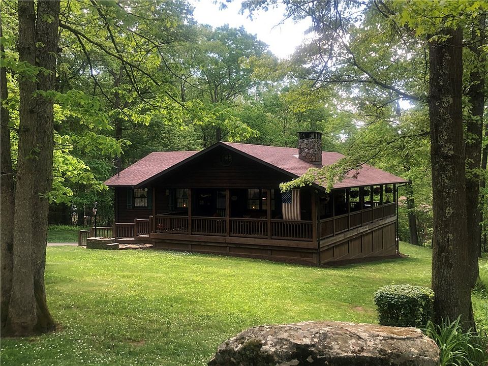 GORGEOUS MOUNTAIN RANCH IN DEER LAKE! This 3-bedroom Cedar beauty features a large wrap around covered deck w/redwood ceiling, on a woodsy parcel full of pretty flowers and plants, big natural rocks, and a fast walk or golf cart ride to your 77-acre Lake for fishing, boating, swimming and relaxing the day away, boat rack included! The rustic living room, warm and inviting has a floor to ceiling stone propane fireplace, open to an ample fully equipped kitchen with large seating/prep island and dining area. The bedrooms and main bath are on the first floor, lower-level features family room, laundry w/half bath, large walk-in closet and a nice garage/workshop! Walk out to a lovely yard, nice asphalt driveway with plenty of parking and turn around area, lower-level patio for pleasure or use it to store your side by side! Near all the Lake amenities, tennis court, playground, walking trails around the lake! Near Ohiopyle State Park, Md/WV state lines, 1 hr to Pgh, 30 min to Morgantown!
