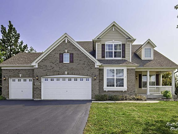 Freshly painted and beautifully maintained brick front home on premium lot overlooking pond, walking paths, wetland and wildlife. Much sought after first floor owners suite plus 3 large bedrooms upstairs. Open concept from the moment you step in the foyer. Front office/den with double doors great for working from home! Be a part of all your gatherings with the expansive kitchen/family room design. Large 2 story great room w/fireplace open to huge kitchen w/breakfast bar, center island, double oven, sunny eating area and cooks dream kitchen! New Microwave recently installed. True full basement for future expansion and large 3 car garage. Plenty of outdoor entertainment space with 3 patios, swing set landscaped area and inviting covered front porch. Professionally landscaped yard and don't miss the private fenced spa area with jacuzzi tub! Brand new water heater recently installed. Quick Close Possible! Easy access to I90 from Rt 47 and minutes from Metra Train.