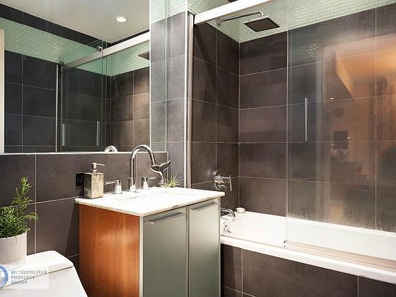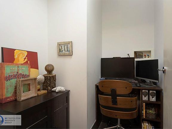 Welcome to the best value 1 bedroom condo in a luxury Williamsburg doorman building! This unit is well laid-out with high ceilings, hardwood floors and central HVAC. The open chef's kitchen features quartz counters, ample cabinetry, and state-of-the-art stainless steel appliances; Viking range with hood, Viking fridge, and GE Profile dishwasher. The bedroom can easily accommodate a king size bed with plenty of space to spare. The closet has been beautifully customized to maximize storage usage. The modern slate bathroom features a beautiful Carrera marble-topped vanity, Kohler fixtures, oversize mirror, and Zuma deep soaking bathtub with rain shower and frameless doors. Unit has a separate utility room with washer and dryer hookups. Currently the space is being creatively used as a home office, with room for additional storage. Four15Leonard is centrally located between the L & the G subway lines allowing options for commuting. Cross the street to McCarren Park and enjoy the many public outdoor amenities including track, swimming pool, soccer field, rec center, tennis bubble, baseball field, basketball courts, skate park, Citi bikes, and dog friendly parks. Do not forget the weekly Saturday farmers' market, MOFAD, and tons of great restaurants and shops all within minutes away. The building has a 421A tax abatement in place until 2024, with friendly doormen, on-site super, and common outdoor sundeck with all-weather gas and charcoal BBQ grills. Contact Jamie ; Gerald for a private viewing.