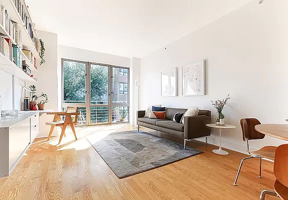 415 Leonard Street 3F: McCarren Parkside life is a perfect combination of excellent living and urban chic. As you enter this 1bed/1bath, you are welcomed with a generous amount of natural light through the oversized east facing windows. 9-foot ceilings enhance the already spacious living room that is laid out with sitting, working, and dining spaces. The custom modular Vitsoe workspace installed in the living room allows you to work from home effortlessly. Step out onto your private oasis to enjoy fresh air, or sip your morning beverage in the sun as you people watch from your 3rd floor balcony. The open kitchen boasts top of the line stainless steel appliances (Sub-Zero Refrigerator, Miele Dishwasher, Viking Stove), and beautiful cherrywood cabinetry. Polished black granite counters sit atop an oversized and functional kitchen island with additional cabinetry below. The generous bedroom has sunny eastern exposures, ample closet space, and plenty of room to accommodate a king size bed. Additional storage can be found in the linen cabinet and living room closet. A pleasant surprise is the oversized walk-in storage room near the apartment entrance with built out shelving and stackable Bosch washer/dryer. Nest smart system controlled central heating & AC allows you to set the perfect temperature to come home to right from your smart phone. Beautiful hardwood floors throughout this spacious 681 sq ft apartment. Conveniently located near McCarren Park's track, pool, and dog park, The 415 Leonard Condominium is comprised of 55 units with amenities including part-time door staff, two elevators, landscaped and furnished common sun deck with grills, a children's playroom, and bike storage. Convenient onsite parking and storage units are available for rent. This pet friendly building maintains a 421a tax abatement through 2024.Seconds away from cafes, boutiques and an array of delicious restaurants, this property is directly across the street from McCarren Park. A few blocks to the L/G trains (L- Bedford Ave, L/G Lorimer/Metropolitan and G-Nassau Ave) Freshly painted and ready for you to live who you are!