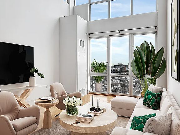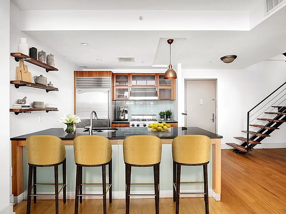 Double height living room ceiling (19.5 feet) and a corner full of windows offer amazing light throughout the day. The chef's kitchen features high-end stainless-steel appliances and ample storage. The master bedroom can fit a king-sized bed and is situated on the lower level. The upper level of the duplex can function as a guest suite or office space. Each level offers a full bathroom, and the unit includes a full-size washer/dryer.