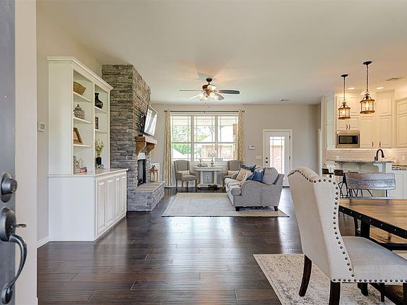Don't miss out of this amazing bungalow on Blanchard's Main Street! Huge Covered front porch to sit and watch all the parades. Once inside you will enjoy the open floorplan, with dining, kitchen and living all together to make a great place for a crowd. So many amazing features like the dry stacked stone fireplace with built-ins on both sides, large dining area or use it for a piano or 2nd sitting area. The kitchen has a breakfast bar, a lot of counter space and is bright and cheery! Primary bedroom is spacious and the full attached bath has double sinks, a ton of storage, tub/shower combo and a walk-in closet. On the other side of home there are 2 secondary bedrooms that are good size and adorable with a full bath between them. Full bath offers storage and tiled tub surround that goes all the way to the ceiling. Laundry room is huge with sink, counterspace, a window and cabinets. Backyard is amazing with a huge covered back porch and an easy walk from house to oversized 2 car garage. Backyard also offers a great place to garden and/or play. Detached 2 car garage is accessed by the alley. So many things to love about this custom built, one owner home.