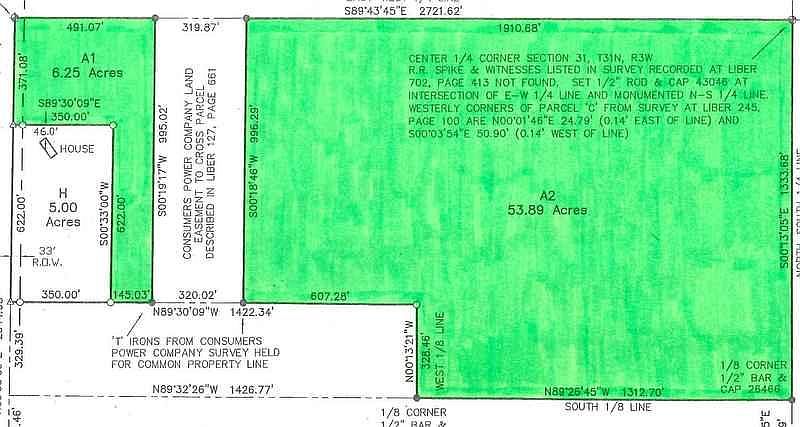 60 acres close to town on a county maintained road. 6.25 acres on the road, separated by Consumer Power Company land and 53.89 acres.