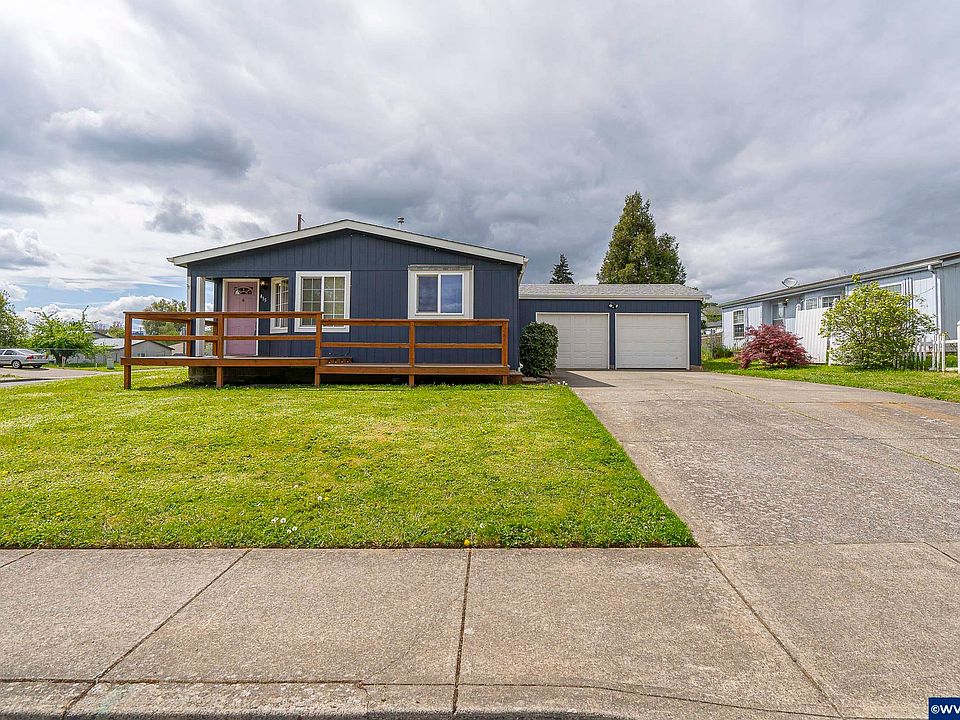 Exceptionally well maintained manufactured home on its own land. Cute little breakfast nook. Kitchen skylight, wood cabinets, & pantry. Large master bedroom with walk-in closet and master bathroom with new walk in shower. Large double garage with lots of shelving, garage opener, and backdoor to deck & private back yard. Corner lot close to Walmart, Safeway & Hwy 22 access. Newer roof, furnace, AC unit and exterior paint. Indoor utility, den/office could be 3rd bedroom. Home Sold as IS, no known issues.