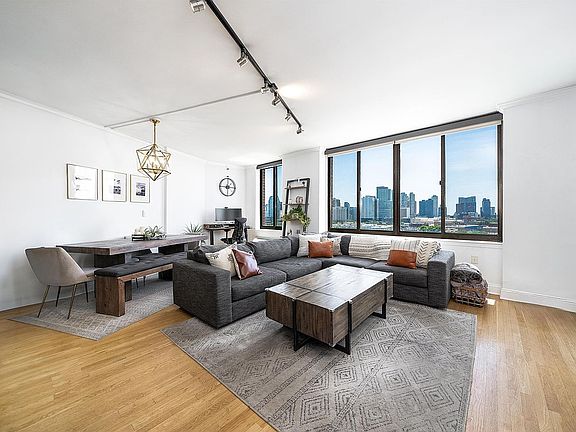 Experience luxurious living in this spacious 2-bedroom, 2-bath condo spanning nearly 1,275 sq. ft. Situated on the 10th floor with southern exposure, this home offers unparalleled privacy and abundant natural light, with no buildings obstructing your view. The condo features a completely redesigned open kitchen, boasting quarts counters, large center island with wine cooler, custom cabinets, clean line tile backsplash, and stainless-steel appliances. This modern kitchen seamlessly overlooks the expansive living and dining area, perfect for entertaining. Both bathrooms have been elegantly renovated, adding a touch of sophistication to your daily routine. The master bedroom easily accommodates a king-size bed and includes a large walk-in closet with custom organizers. Unwind on your private balcony, where you can enjoy breathtaking views stretching from downtown Manhattan to Jersey City and beyond. The building, constructed from steel and concrete, includes an elevator, laundry on every floor, and a gym for your convenience. Located across the street from a shopping center, this condo offers easy access to daily necessities. Commuting is a breeze with the PATH, ferry, and bus services just a short distance away. Don’t miss the opportunity to call this exceptional property your new home!