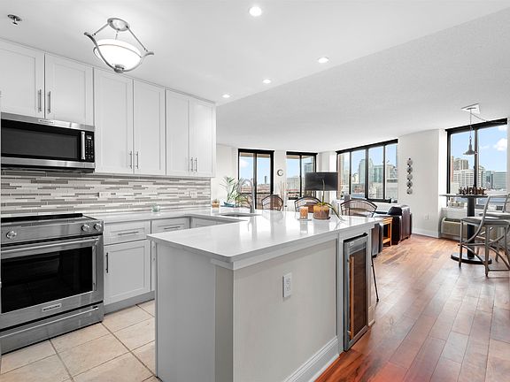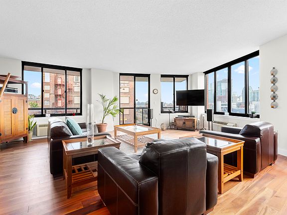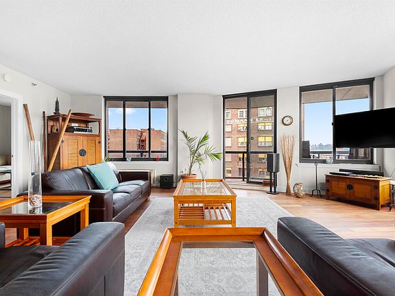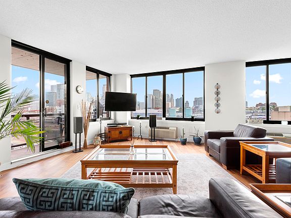 Move right in to one of Hoboken's most desirable and well maintained residential condo buildings. A gorgeous and spacious 1270 sq.ft corner end unit featuring 2 bedrooms and 2 full baths. Living Room has beautiful glass windows allowing sun drenched warmth to fill an open layout w/ NYC views and beyond. Just slide the glass door open and step out to a spacious corner balcony, perfect for relaxation and taking in breathtaking views of sunrises and sunsets. Brand new white kitchen shaker style cabinetry, artistic designed glass backsplash, white quartz countertops with an oversized breakfast bar which seats 4, stainless steel appliances and built in wine fridge. 2 separated full length hallway closets with built in organizer systems leads into Primary ensuite, with private full bathroom w/ seamless glass shower door. Second bedroom has sliding door closet space with built in organizer system. A perfect private space for working from home. Premium Brazilian Tigerwood 6" wide plank Hardwood flooring throughout. Deep closet space in front entry hallway. Separate temperature controlled heat/ air conditioner units in each room to get the perfect climate setting. Entire unit has been freshly painted. Deeded parking space in garage with elevator access. Locked mailroom. Private gym. Laundry room w/ 2 large capacity Washers and Dryers right outside your hallway door for easy access. Pet friendly building. Conveniently located just minutes away from Hoboken PATH train, NY Waterway Ferry Terminal and buses ~ Easy commute to NYC. Located downtown and close by to everything wonderful Hoboken has to offer. A must see to appreciate...