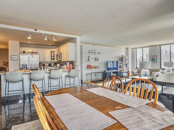 Sun-filled, spacious, and airy 2 bedroom, 2 bath 1200 sq ft unit in an extremely convenient location. Step into this huge open concept space with gleaming hardwood floors, featuring the following: Kitchen with breakfast bar, Stainless Steel appliances (dishwasher, microwave, refrigerator, range & oven), and granite countertops. Dining/Living Area with private Balcony facing south for great views of downtown JC and a glimpse of downtown NYC. Master Bedroom has huge California Walk-In Closet, and in-wall AC /Heat in every room. This prime location concrete and steel building includes elevator, secure entrance, lobby area, shared laundry on each floor, and gym. All these features AND deeded garage parking is all you could want and more! Come see for yourself!