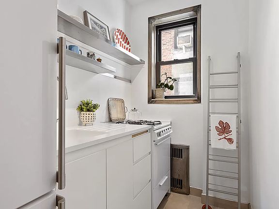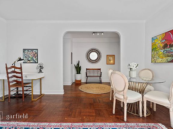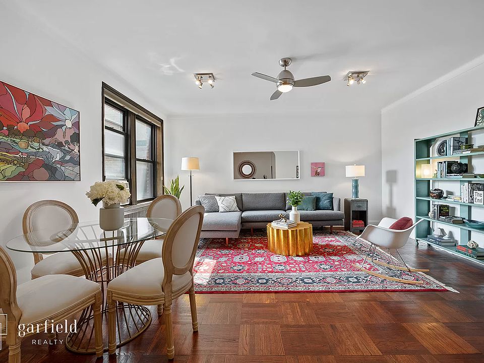 Boasting seven windows filtering four exposures, this sun-filled, elegantly renovated pre-war 1BR sits on a high floor of an elevator building and offers a flexible layout with ample space to work from home. A large foyer welcomes you with charming built-ins, archways and moldings. Relax in the spacious living/dining room. Cooking is a treat in the bright, modern galley kitchen recently updated with white cabinetry, Corian countertops and backsplash, tile flooring, a gas range and Blomberg refrigerator. Delight in a sizable, airy bedroom that invites a lovely cross-breeze through corner windows and is accented by a ceiling fan. The windowed bathroom is crisp and clean with stylish finishes. And with a roomy floor plan, the home can comfortably accommodate your remote workstation. Additional highlights include ribboned hardwood flooring, new lighting fixtures and generous closets throughout. Situated on the fourth floor of a well-maintained elevator building in the heart of Kensington, the home is steps from a variety of shops, restaurants and mass transit options. The pet-friendly building features a newly renovated lobby, superintendent, communal laundry facilities, extra storage and dedicated bike storage. Just a 20-minute walk to majestic Prospect Park and the Kensington Dog Run.