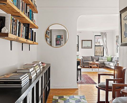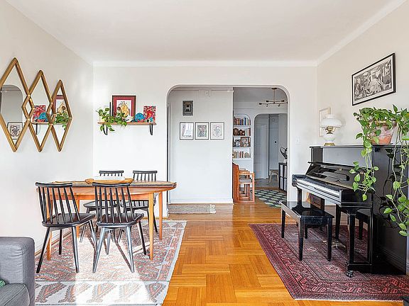 415 Ocean Parkway, 4G, is a special 3BR/2BA home sprawling approximately 1300 square feet, with eat-in kitchen, mud room, library, and sun-flooded west-facing living room and primary suite. This prewar treasure features arched doorways and original floors, hardware, and tiling, stylishly augmented with updated electrical, fixtures and fans throughout the apartment (all of which convey with sale).