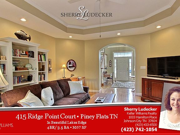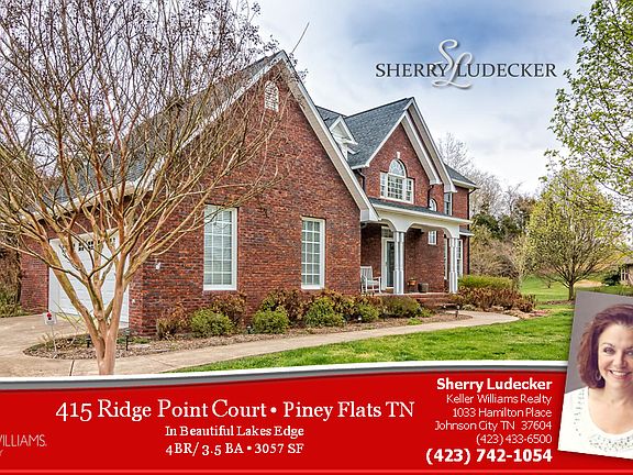 MLS#360522 | 415 Ridge Point Court | Piney Flats TN | 3057 SF | 4BR/3.5BA | List: $365,000. First time on the market! Beautifully-maintained home in Lakes Edge Subdivision, centrally located to all areas in the Tri-Cities. Home has two brand new heat pumps; New Roof in 2011; Recently refinished Hardwood floors and New Carpeting in all Bedrooms. Kitchen features a Granite counter/bar, new glass tile back splash, breakfast area with gas-log, 2-sided fireplace which also opens to the living room, new built-in microwave. Master bedroom on the main level has a spacious ensuite bath w/ jetted tub and separate shower. Master closet is complete w/ built-ins. Main level also includes a dining room, full bath and an office. Lovely staircase leads to 3 additional bedrooms and a full bath on the 2nd level plus a walk-in attic for additional storage. Lot is completely level and cleared in the front. The partially-wooded back yard is an oasis of privacy and relaxation complete with shade and rock gardens, a koi pond and a newly added fire pit patio and walkways. Back deck is partially- covered, newly-stained and gated for children or pets. Wonderful Workshop area and lots of storage are located in the basement which has a an entrance in the back of the house. Lakes Edge Subdivision has a private boat dock for residents. Property includes a deeded parking spot in the community RV Storage Lot for your boat, trailer or motor home.