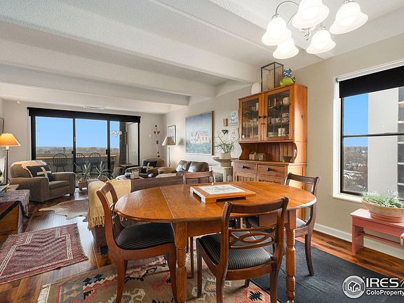 The apartment sits high up with spectacular views of the city and horizon (think sunrises) nowhere else to be found in Fort Collins.The end unit (on the south side) provides wider views and the extra window in the living room relieves the tunnel/dungeon feeling of units situated in the middle of the building. Unit N1009 offers an uninterrupted view of the spectacular Rocky Mountain fourteener, Longs Peak, to the southwest. This east-facing unit is on the side with great climate, early morning sun and mild afternoons, this avoids weather from the stormy westerly mountain winds or heatwaves from the afternoon sun on the western side. The perfect climate situation makes moderate use of AC or heating possible. The unit has the original floor plan which optimizes the square footage perfectly. This end unit has almost no foot traffic in the hallway, far from the centrally-located elevators. The closed fire escape provides extra privacy at the south end of the hallway. The unit comes with secure basement parking and lock-up storage space. The parking bay has enough extra room to park up to four bicycles or a motorcycle. This is a building for people who want to walk everywhere; to the CSU campus, Old Town shops, restaurants, and music and sports venues, not to mention that the very popular, free-to-use Transfort bus service routes, MAX, FLEX (to Loveland, Longmont, and Boulder), and bus stations for Routes 10 and 18 are one block away! Don't be intimidated by the HOA, as it includes full time management, security, a plethora of amenities including: pool, hot tub, workout facility, sauna and more as well as all exterior maintenance, ALL utilities, cable/internet and heating/cooling system repairs/installs, this building is truly designed with peace of mind as a top priority.