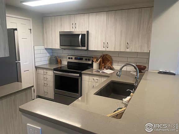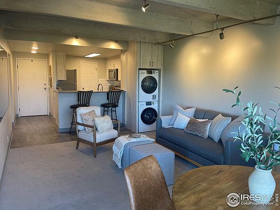 If not the nicest remodel then truly one of the top complete remodels in the building. Removed wall between kitchen and living area to create a flowing open floor plan. New flooring and lighting throughout. Updated kitchen with new modern cabinets, quartz countertops and eat up bar, full tile backsplash, high end appliances. Complete bathroom remodel with new vanity, lighting, fixtures, stool, mirror and full glass walk-in shower with floor to ceiling tile. New windows and sliding door leading out to patio. Since this unit is on the 8th floor and facing west, you have those highly desired views over the trees of the foothills and mountains. The asbestos textured ceiling was completely removed to create the bare loft ceiling that is now so popular. A laundry area was installed which is very rare in this building. There is one deeded parking space included. Amenities include one indoor pool spa, sauna and bathrooms with showers, one outdoor pool, work out facility, game/billiards room, party rooms with kitchens, secured bike storage area. Building does have elevators. All utilities covered in HOA fee.
