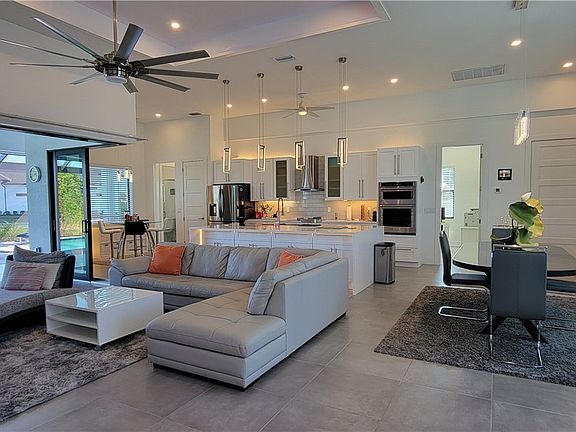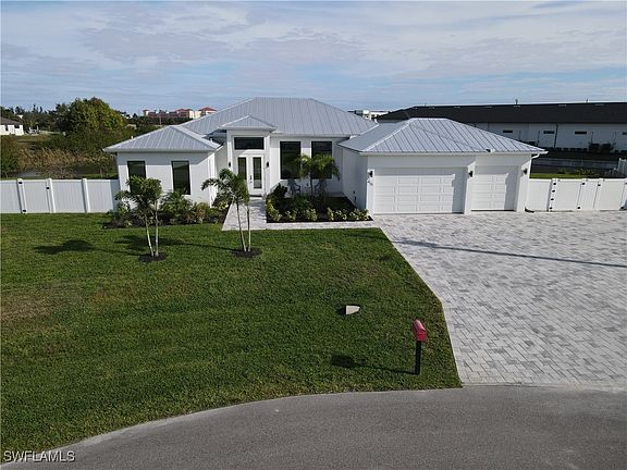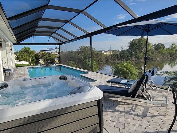 MORE FEATURES: -- Oversized 3 CAR GARAGE -- Oversized paved DRIVEWAY with enough room to park more vehicles -- Oversized POOL DECK -- TILE FLOORING throughout, including GARAGE and PATIO --Two independent AC UNITS -- All IMPACT WINDOWS -- 2 x 8 ft PGT CORNER sliding glass doors in living room and master bedroom --METAL ROOF --Upgrade Kitchen Aid and Samsung APPLIANCES -- Upgraded plumbing fixtures -- QUARTZ countertops in kitchen and bathrooms -- AUTOMATED "Zebra Blinds" at front door and dining room windows -- privacy window TINTING in front of the house -- Huge privacy FENCE with gates -- Built in automated multifunction Storm Catcher HURRICANE SHUTTERS to cover lanai. They can be used as beautiful and convenient sunshades as well -- 14' x 28' POOL with 8' x 8' SUN SHELF -- electrically heated 51 Jets OFFGROUND SPA with LED lights – EXTRA WIDE CAGE with picture windows -- Paved deck / sitting area direct at the water.