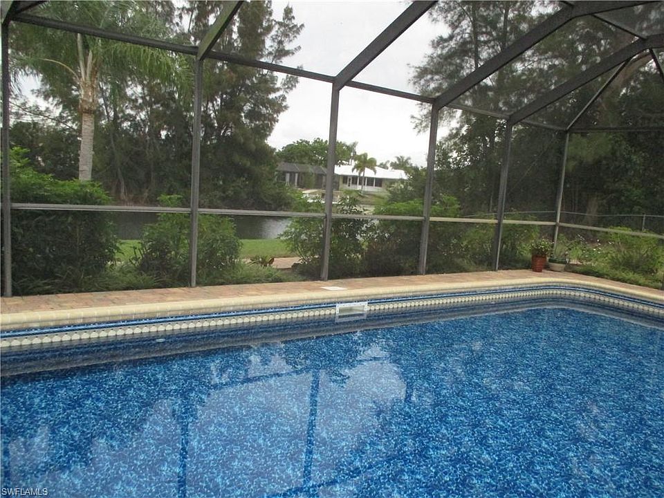 Lovely freshwater SW Cape Pool home, on a three lot site and oversized canal. High ceilings with a formal living/dining area and a separate family room. Pool is huge and the lanai is also large. It has pavers and the walkway to the dock is also pavers. The yard is fenced. Concrete dock is well maintained and painted. Back yard contains a very large storage shed. Granite and stainless in the kitchen with wood cabinets, bathrooms are updated, tiled throughout. Roof is 2019. In the garage, the floor was just epoxied and the garage has pull down stairs. Windows are impact glass. Property is on city water and sewer but, there is a well that waters the grass and fills the pool. Well pump (2020). There is a slider out to the pool area from the master bedroom and the second bath is a pool bath. Furniture is negatable.