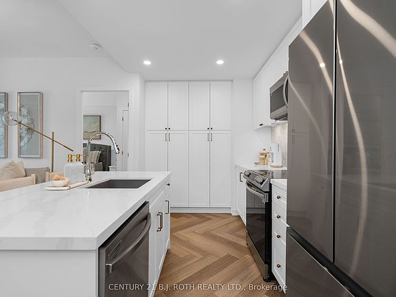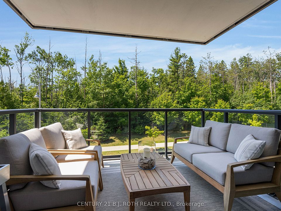 Available fully furnished for optional turnkey convenience! Effortless Luxury in Friday Harbour's Exclusive High Point Building-A Designer Escape Crafted for the Most Discerning Buyer! Beautifully upgraded 2-bed, 2-bath condo in the prestigious High Point building. Professionally designed by Harbour Home Interiors, this suite offers a rare blend of luxury, comfort, and convenience-Perfect for full-time living, weekend escapes, or investment. Soaring 10' ceilings and floor-to-ceiling windows flood the open layout with natural light and tranquil forest views. The spacious balcony extends your living space outdoors, inviting you for morning coffee or evening wine. The kitchen features upgraded shaker-style cabinetry, stone countertops, a designer backsplash, and top-of-the-line Samsung appliances, including a fridge with filtered water and ice. A large island offers casual bar seating - ideal for entertaining or remote workdays. The primary bedroom includes a walk-in closet with a custom organizer and a spa-like 3-piece ensuite with a glass shower and upgraded tile. The second bedroom offers a Murphy bed, a closet with a custom organizer, and a lockable owner's closet. Frameless glass doors in all closets, including the foyer, provide a sleek, modern feel. Highlights include luxury vinyl flooring in a striking herringbone pattern, designer lighting, multimedia wall blocking (no visible wires), and a custom-made pull-out sofa bed. Over $30,000 in premium finishes, decor, and furnishings. Exclusive building amenities: private pool, hot tub, games/party room. Friday Harbour offers four-season living with a beach club, marina, splash pad, playground, nature trails, and the Lake Club with full gym, restaurant, and sauna + weekly waterfront entertainment. Golfers will love the award-winning course, ranked 52nd in Canada. Enjoy exquisite restaurants, casual eateries, and vibrant bars - all steps away! Includes underground parking near the elevator and a storage locker.