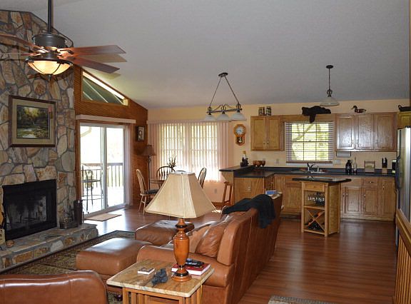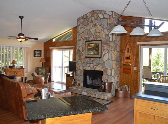 Spend the summer or all year in this well maintained, move in ready home. Grill out on the L shaped Viewing Deck or cozy up to the rock wood burning fireplace. This home features Vaulted ceilings in the living, dining, kitchen concept area, 2 bedroom 2 bath upper level with a walk out lower level with a bath, sleeping area, kitchen and great room. Expanded deck area on both levels including a Jacuzzi. A circular drive with drive through oversized carport. Paved road all the way to house and underground utilities. And a beautiful View as well!!!
