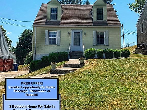 Fantastic Remodel/Development Opportunity! This two-story Cape Cod style home is a fixer-upper located in the desirable Crescent Township neighborhood of Pittsburgh! This 3 bedroom home has a 4-car driveway and over 1,100 finished sq.ft. of quaint and spacious living area. The home requires rework on the roof (waterproofing) and basement (waterproofing), as well as a remodel of the timeworn kitchen and bath. With some TLC however, the inside has a perfectly sized kitchen space for cooking family meals alongside a large and inviting dining room that is perfect for entertaining guests and spending your evenings together. Along with the large kitchen, living and dining areas for family and guests, the first floor also has a full bathroom and a large enclosed space which can be used as a first floor office or first floor guest bedroom. Heading upstairs, this home features two large bedrooms ideal for a gorgeous master bedroom with a walk-in closet and a large secondary children's bedroom, guest room, or office space. Heading out into the neighborhood, this home is a walker's paradise for a young family, with Bon Meade elementary just 3-minutes away on foot.