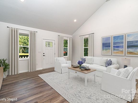 Absolutely STUNNING new construction ranch home on HUGE .79 ACRE LOT in the heart of Cherryville with No HOA! The cute front porch welcomes you into the open floorplan w/ high cathedral ceilings, industrial ceiling fan, LVP floors, upgraded modern finishes & lots of windows! The show stopping kitchen features white soft close cabinets, granite counters, breakfast bar, dishwasher, fridge, tile backsplash, farmhouse sink, hood & breakfast area w/ sliding doors providing extra light. The beautiful primary suite features tray ceiling, 2 closets (1 walk-in), accent wall & ceiling fan while no expense was spared in the stunning bath w/ dual vanity, granite countertops & large custom glass & tile surround shower. LVP flooring & tile - no carpet, upgraded lighting & hardware, private lot surrounded in mature trees & large deck to enjoy gatherings. Located rnear quaint downtown Cherryville w/ shops, dining, coffee, parks & rec areas - so much to do! Huge L-SHAPED YARD EXTENDS BEYOND VIEW!