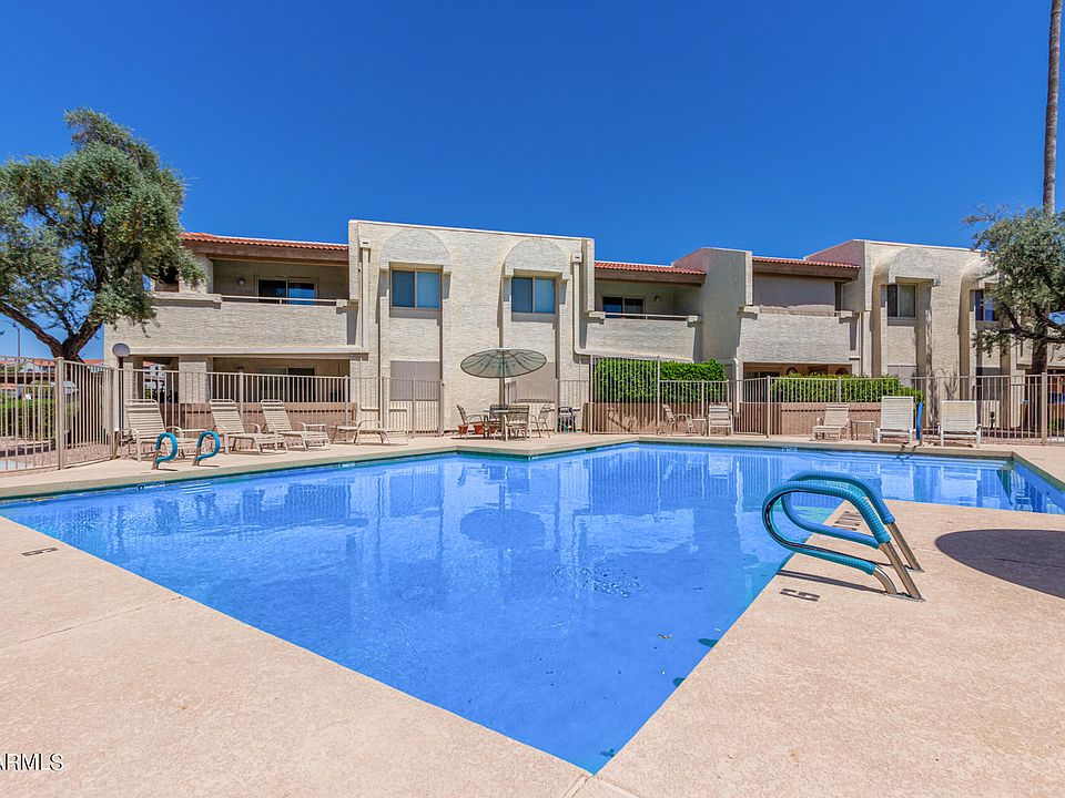 Welcome to this beautiful 2 bedroom, 2 bath unit in Las Casitas. Both bedrooms feature walk-in closets and the Primary bedroom has patio access and a full bath. The sliding doors open to the private covered patio, with your own private pool entrance where you can relax & enjoy the Sunkissed Arizona lifestyle! Poolside unit and the greenbelt/walking paths are easily accessed. Also only a short walk to Stone Creek Golf Course & the soon to be NEW ''PV RE-IMAGINED''. This nice quiet community is within walking distance of restaurants, entertainment and shopping and easy 51/101 access. There is one dedicated covered parking spot with the unit and ample guest parking. A MUST SEE!