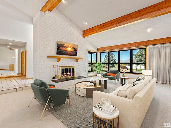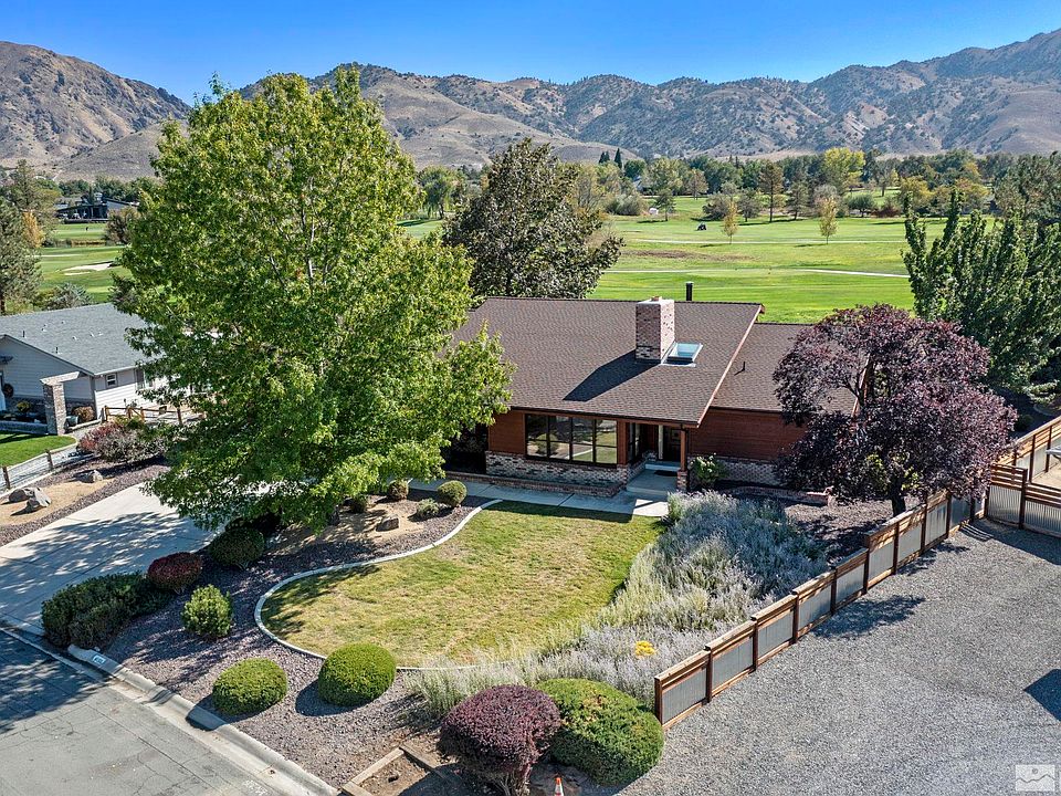 DESIRED LOCATION! Custom home on the Hidden Valley Golf Course with golf cart gate for immediate access. The formal living room features a gas log fireplace, and western views of Southeast Reno. The formal dining room includes a wet bar. The family room is adjacent to the uncovered patio and has a wood burning stove, and built-in cabinets. Primary Bedroom ensuite features two walk-in closets, stall shower, and a "walk-in" bath tub. There are ceramic tile floors throughout the common areas., No HOA, Golf Club Membership is available separately. The kitchen is spacious with views of the golf course and majestic mountains. The garage is listed as "2 car garage", but is oversized at 870 square feet. The north garage door bay is 23.5 feet deep, so yes, it will accommodate a Quad Cab Truck! The south garage door bay is 18 feet deep and was able to accommodate the owner's Ford Explorer. A covered patio area was built for golf cart storage. The exterior is freshly painted and interior walls are a blank canvas awaiting the buyer's color scheme! Images of Living room, Dining room, Family room, and Primary bedroom are virtually staged.