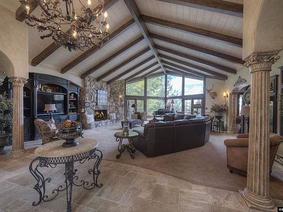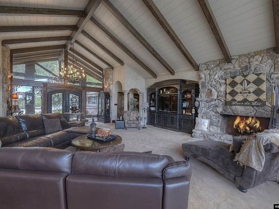 This magnificent Lakeview home is situated perfectly on 2.09 acres. This 4 bd, 4.5 ba home, nestled in the trees, boasts luxurious amenities. Enter the living room with vaulted and wood beamed ceilings, a floor to ceiling stone fireplace, and views of the lake. The spacious kitchen is the "heart" of the home and features gorgeous granite countertops, beautiful cabinetry with pull outs, two copper sinks, a prep island and a breakfast bar island, pantry and fireplace. The nook table and refrigerator stay.