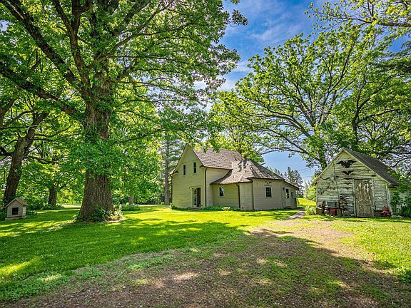 Country at it's finest found here. Beautiful private wooded 5 acre parcel with trails & wildlife galore! Home has several updates including newer steel roof, vinyl replacement windows, tankless water heater, all appliances, main floor laundry & hardwood floors. Basement has new concrete floor, drain tile & block. Pole barn is 26x32 w/concrete to store all the toys! Summer kitchen & old grainery completes this charmer. New mound system was installed just months ago .