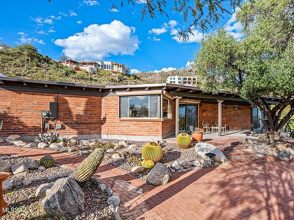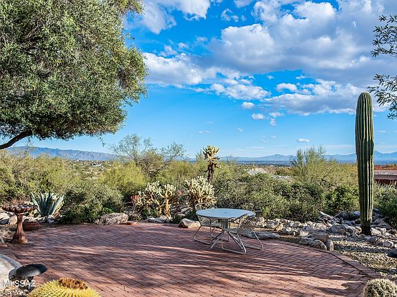 Discover serenity and scenic beauty with this charming burnt adobe home perched high in the Catalina Foothills with unparalleled city skyline and mountain views. This special 3 bedroom, 2 bath territorial style home is surrounded by dozens of majestic mature saguaros, mesquite and palo verde trees. The living room boasts a stone floor-to-ceiling wood-burning fireplace that looks out to a lovely private brick patio. This thoughtfully designed functional floor plan features porcelain tile floors that connect the kitchen, dining room, living and family rooms. Abundant storage is offered in the kitchen with a large walk-in pantry, as well as a walk-in storage closet/workroom off the 2 car garage. Rolling shutters have been installed for your security and peace of mind. This home is conveniently situated just north of La Paloma Golf and Country Club and close to La Encantada shopping center offering fine restaurants with upscale shopping. Finger Rock trailhead and many other hiking trails are also a short distance away. Located in the coveted Catalina Foothills School District.