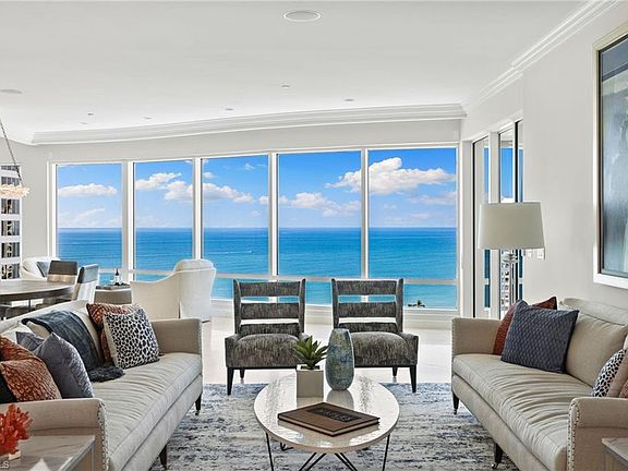 Perched on the 17th floor, this stunning residence at The Provence offers breathtaking Gulf views. Spanning 3,952 sq. ft., this luxurious property features an expanded floor plan with two spacious screened terraces and water views from every room. Elegantly remodeled, the residence boasts high-end upgrades, soaring 10 ft ceilings and floor-to-ceiling windows that frame the sparkling Gulf of Mexico and bay vistas. The chef's kitchen is a dream, outfitted with custom cabinetry, premium stainless steel appliances, a wine storage unit, an oversized farmhouse sink, a center island, and a breakfast bar. Each bedroom is designed with upgraded wood flooring, en-suite bathrooms, and walk-in closets. Additional highlights include two designated under-building garage spaces, an electric vehicle charging station, and a large storage locker. The Provence defines luxury living, with amenities such as a stunning pool, spa, outdoor kitchen area, guest suites, fitness center, tennis courts, sauna, 24-hour security, and on-site management. Residents also have access to boat docks at the Venetian Bay Yacht Club, private beach access, and the Park Shore Promenade—a scenic 1.3-mile path along the beach. Located across the street from the dining and shopping of Venetian Village and close to Waterside Shops and downtown Naples, this beachfront high-rise offers the perfect balance of sophistication and the Southwest Florida lifestyle.