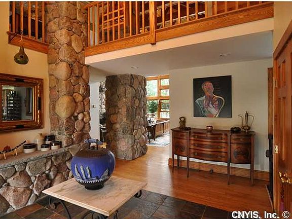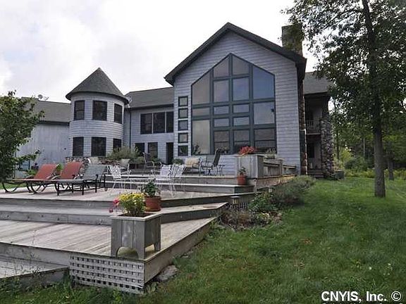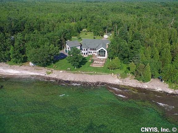 Waterfront home is architecturally inspired by Adirondack Camps and Frank Lloyd Wright.Native stone and cedar shake exterior.Open fl plan, 4,383 sq ft, 5 bed,5 &2 1/2 baths includes,baths w/Jerusalem limestone and ceramic tile,custom woodwork of cherry and pine throughout,Limestone fireplace and columns,an open kitchen w/granite and Blue Stone,Copper illuminated ceiling in the dining area and cathedral ceilings w/Tiffany lighting.2bd,2bath apartment with fireplace over double garage.Property includes 18.32 acres with private beachfront. Relax & enjoy views & sunsets over Lake Ontario all year