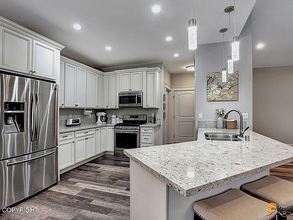 Charming, Like New--Built in 2019 - 3 Bedroom, 2 full bathrooms, Ranch home, in Wasilla on almost an acre. Home includes gorgeous luxury features--- Open Concept with soaring vaulted ceilings. Quartz Countertops throughout, Luxury Vinyl Plank, covered front porch, Large covered back deck, both freshly stained in 2023. Beautiful treed/private lot, gas fueled stonework fireplace.Matching stainless steel appliances and modern pendant lighting. High ceilings with light and bright neutral paint throughout. Kitchen features premium Executive cabinets with soft close drawers and cabinets. Refrigerator included! Extra-large master suite includes custom trayed stepped ceilings and tray lighting. Master en-suite includes walk in shower and large soaking tub. Large ample sized bedrooms. 5 Star Energy Rating. Oversized 900+ sq foot 3 car garage to store your Alaska toys! Utility sink and a custom ramp and storage shelving. 2 new large Raised beds installed in 2023 for summer gardening. Newly installed lush lawns, professionally hydroseeded in 2023. Charming landscaped areas in front and back. Walking distance to Shaw Elementary. Prime Location - Convenient for commute or shopping -- but still feels like you're in the country - this home sits at the very end of the cul de sac for minimum amount of traffic. Located in the serene quiet newer Paradise Park neighborhood near Paradise Lake. Come live in Paradise!!