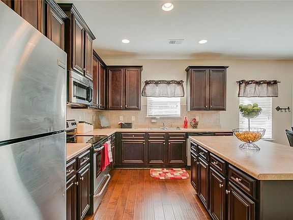 • Kitchen Features: Breakfast Bar, Cabinets Stain, Eat-in Kitchen, Pantry, View to Family Room, Kitchen Island, Solid Surface Counters