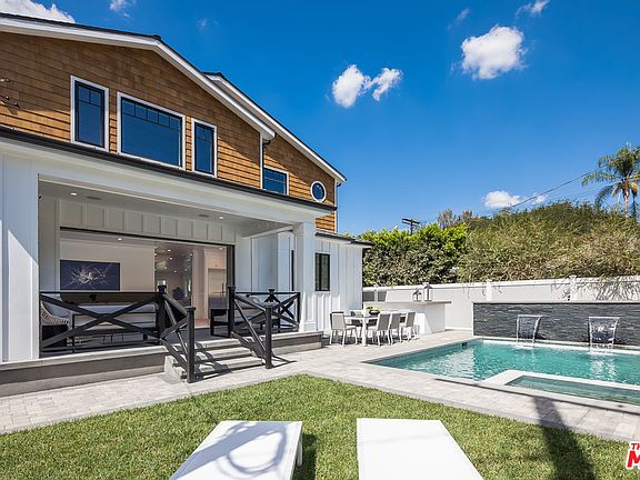 This striking, newly built contemporary Farmhouse features approximately 4,600 square feet of living space and is located in the highly sought after Footbridge neighborhood of Studio City. A perfect injection of provincial charm lends a timeless presence to this modern revival of an east coast estate farmhouse. Property features a subterranean 10 person movie theater, game room and gym. Wide planked Barn Wood floors throughout, 5 en-suite bedrooms, glass wine closet, sophisticated finish work and stainless steel appliances. Master suite with large walk-in closet, built-in book cases, marble fireplace and the perfect master bath. Clean lines and design make this property stand out from the rest. Front and back covered patios. Towering mature trees cascade over the front of home accenting the shake shingles and classic Farmhouse design. Decidedly imposing and contemporary, yet boasting the warmth and maturity one might hope for in a more traditional home. A must see property!