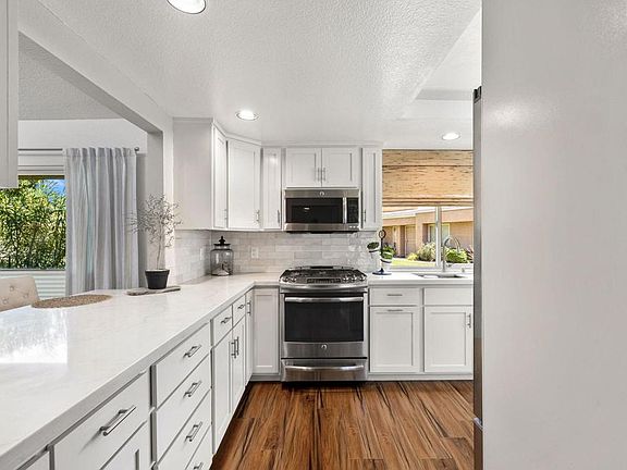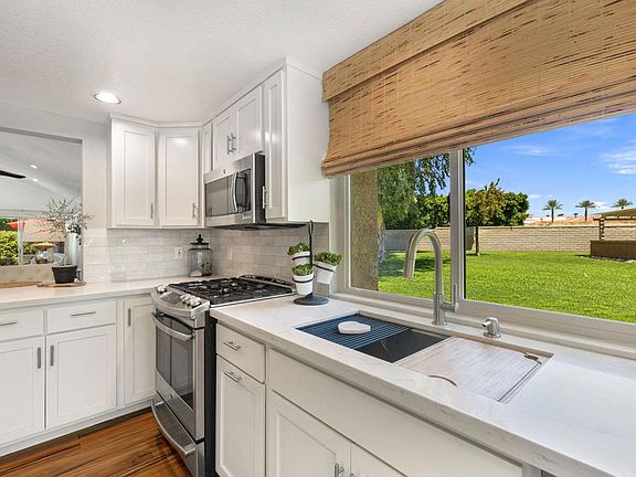 Welcome to Casablanca, tucked away in a beautiful, gated community. Walk into a home full of light and bright space. Vaulted ceilings soar above you in the open-concept living areas. The high ceilings continue in the generous primary bedroom suite. Wood-like porcelain floor tiles, plantation shutters in kitchen and guest bedroom. New paint is used throughout for a fresh, clean look, and the NEW HVAC system ensures comfort and efficiency year-round, as well as, newer double pane windows throughout. The perfect size patio is off the living room facing west to the San Jacinto Peak as well as being surrounded by green space with abundant citrus trees and your very own Meyer lemon tree! The gourmet kitchen boasts quartz countertops with waterfall edge, 28 bottle wine cooler, stainless appliances including a LG refrigerator and LG dishwasher, updated shaker style cabinetry, wood pull-out kitchen shelves, and ceramic white/off-white subway tile backsplash. The dining room space can also be used as a den/office, if desired.Casablanca amenities include low HOA dues, four pools and spas, tennis and pickleball courts, trash pickup, internet, cable, roof maintenance, and landscape.The location is superb, on a quiet cul de sac with no road noise. World-class amenities are close by, including golf, tennis, pickleball, hiking, biking, the McCallum Theatre, and the renowned Arcisure Arena.