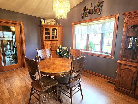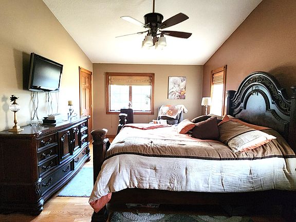 This beautiful home on a large lot, just 4 miles from the city limits, has so much to offer! Large on-suite on main floor with vaulted ceiling in the bedroom, large bath with quality finishes and a walk-in closet. Great home for entertaining with a large dining area right off the kitchen and huge living room with fireplace for those cold winter days. Most of the floors are either hardwood or wood laminate. Two large pantry cupboards in the kitchen offer an abundance of storage. The home also features a beautiful deck out back and a sunroom for enjoying your home year-round. The two-car attached garage is plenty big enough for two vehicles and the large basement and crawl space has even more storage. As if that wasn't enough, there is a 32 X 24 pole barn with second level storage room.
