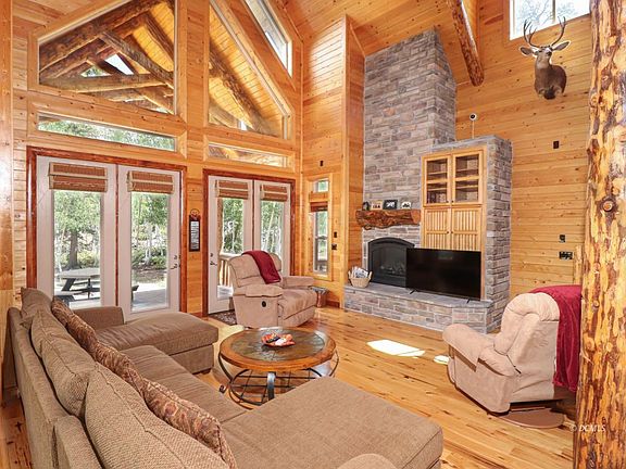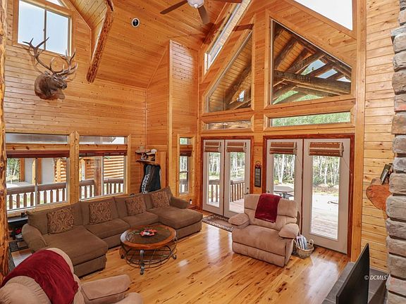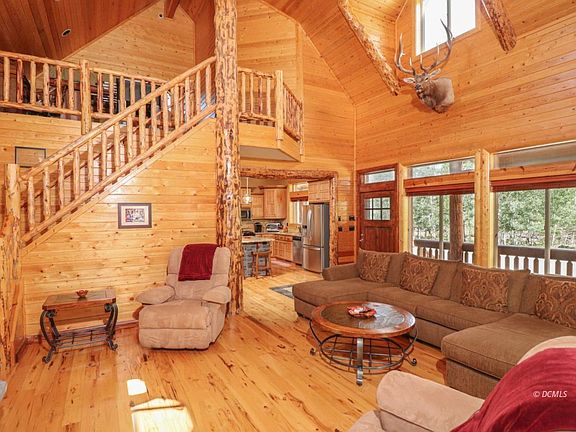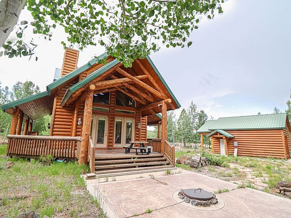 This 3 bedroom 2 bath home is full of special features. Huge vaulted ceilings with custom railings, pillars and beams. Unique windows make for a warm sunny cabin highlighting rock fireplace, hickory wood floors and double french doors to back deck .Kitchen has a beautifully designed island of rock with granite counter top and plenty of storage.This opens into the dining area with entry onto side deck for indoor or outdoor dining. Main floor bedrooms are spacious especially the guest suite with king bed and bunk beds featuring vaulted ceiling. 2nd guest bedroom has beautiful log bed, both have easy access to a full bathroom.Upstairs is master suite offering a separate den with bunk beds, a large bedroom with walk in closet, vaulted ceilings and unique windows. Master bath has relaxing garden tub and walk in tumbled travertine shower. Entry into property is partially fenced with log archway, lava lined gravel driveway leading to asphalt parking space and 625 sq ft detached garage. Most remarkable feature is the absolutely gorgeous aspen forest, a custom patio with firepit that backs national forest. 2nd lot has lava rock, views and magical sound of aspens Furniture negotiable.