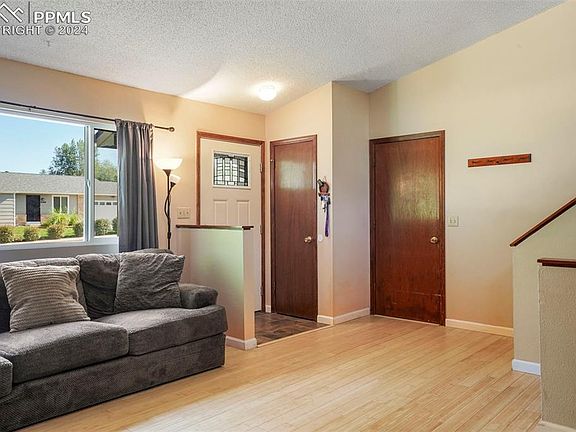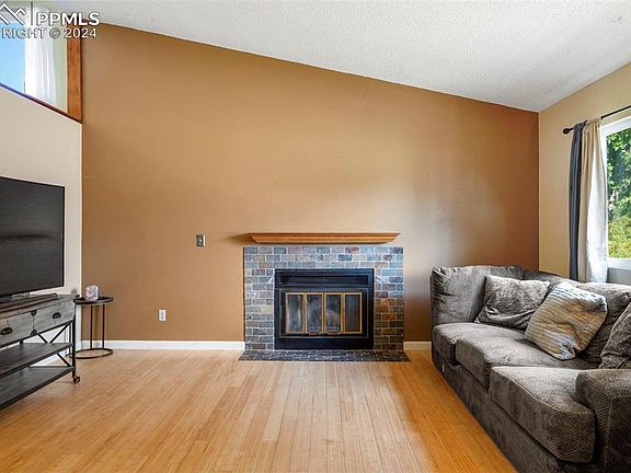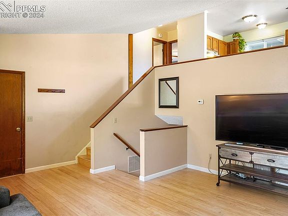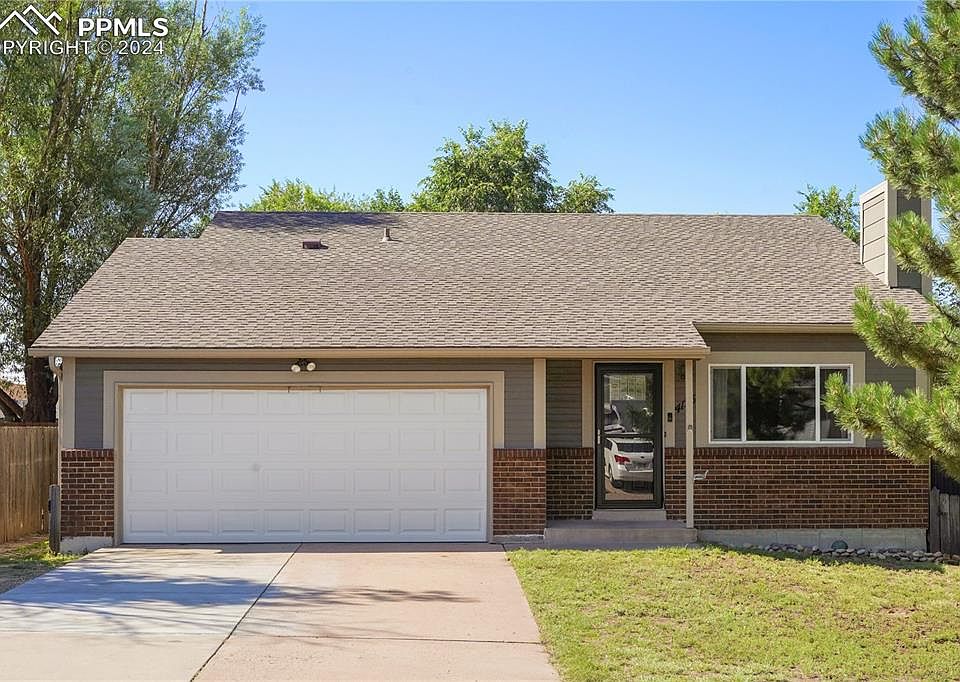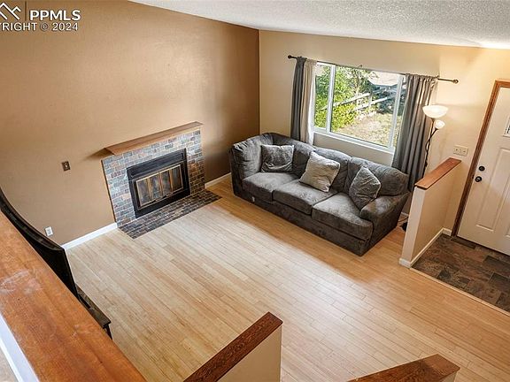 Welcome home! This lovely 3 bedroom tri-level in Bradley ranch has everything you need and more! The open entry way and living room greet you with bamboo flooring, vaulted ceilings and a wood burning fireplace. The eat-in kitchen has ample cabinet space, tile floors, a new stainless refrigerator and dishwasher, and overlooks the main level for an open feel. Walk out from the kitchen to a large and private covered deck with Pikes Peak views. An expansive primary bedroom features a walk in closet, ceiling fan, and adjoins a full bathroom. On the garden level, you'll find two more bedrooms, a full bath, family room, and laundry facilities. The attached 2 car garage features a new opener, and there is also a crawlspace for additional storage.